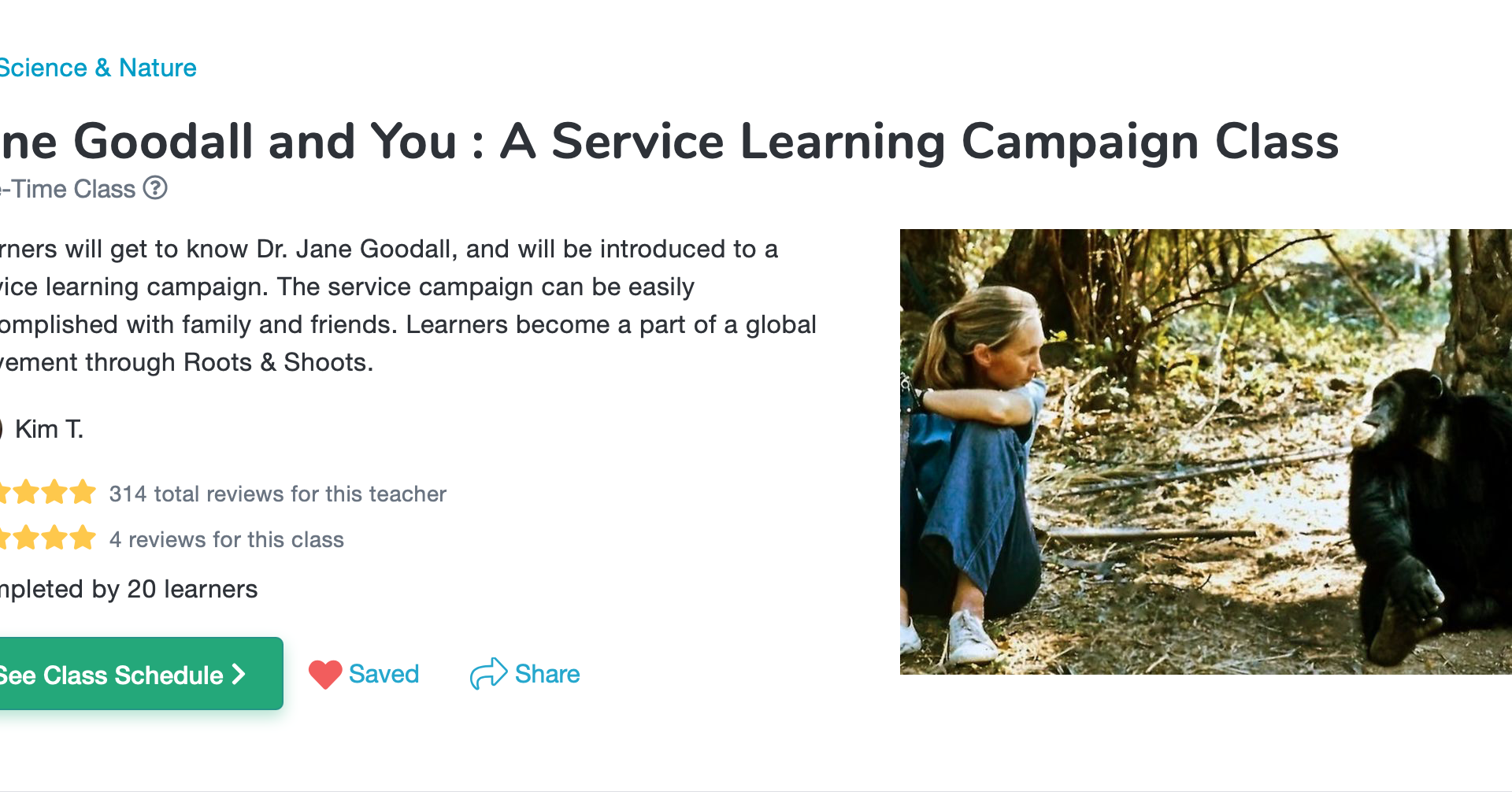 This class will introduce a service project - to initiate a personal or small group clean-up that can easily be accomplished with families and friends. A simple clean up, or picking up trash we find outdoors, is a great opportunity to create a better world for animals, the environment, and us. All earnings from this class are donated to the Jane Goodall Institute. This allows learners to donate to a wonderful organization and cause.