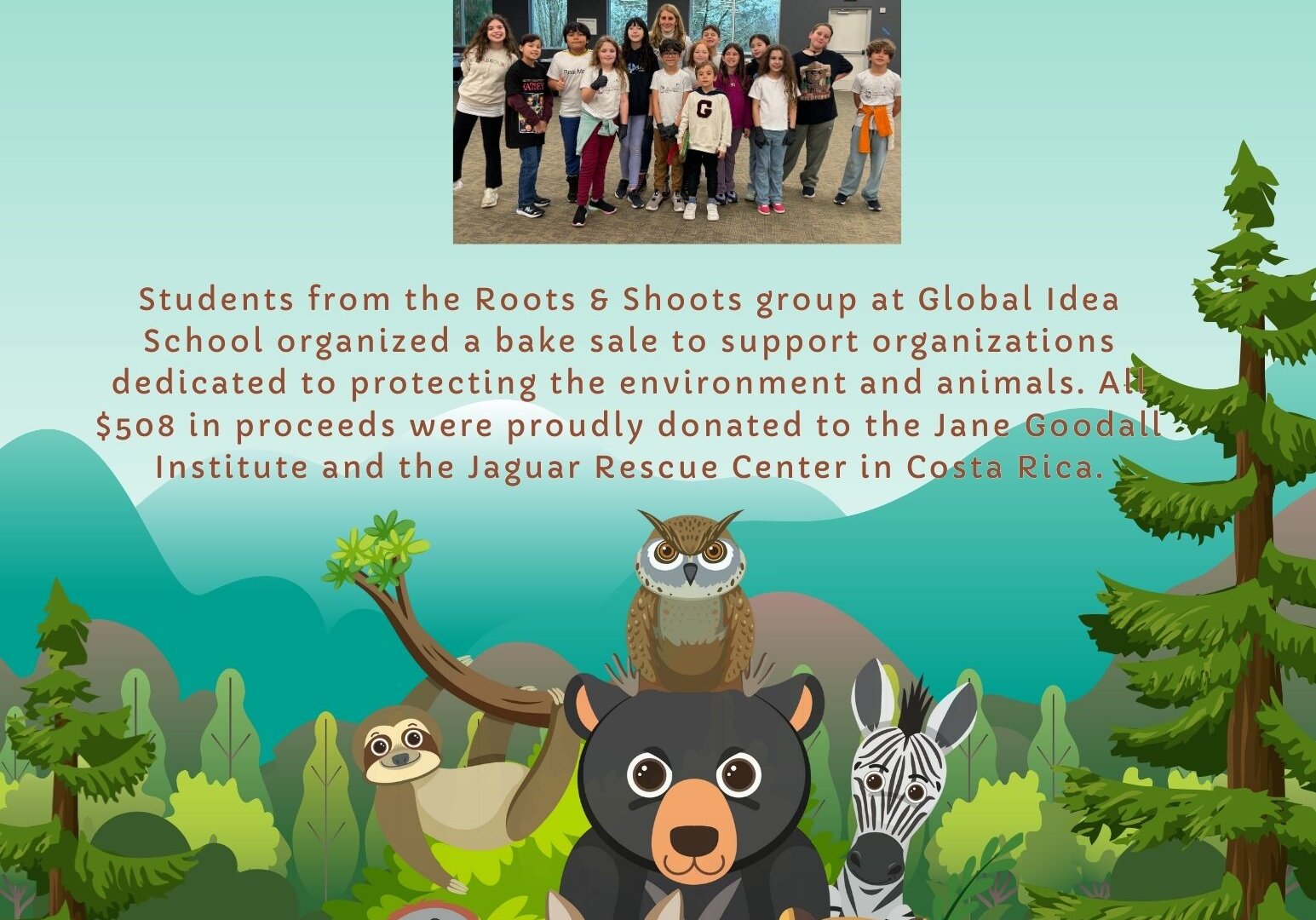 Students were able to raise $508. Through this fundraiser, they learned how to organize themselves, plan an event, work as a team, and understand the importance of helping animals and protecting the environment.