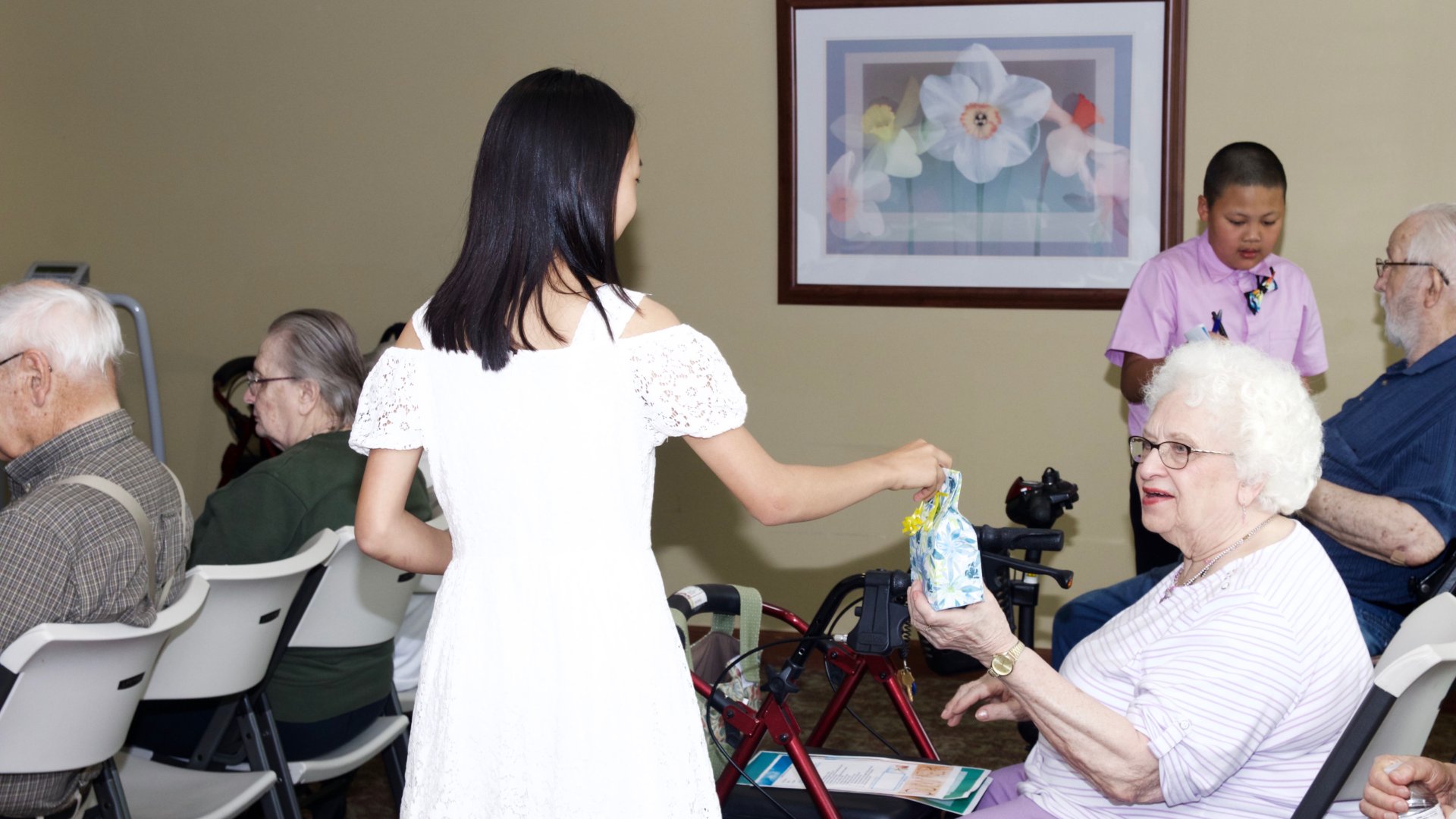 small talk to the elderly while we pass the gifts to them. Bow before the elderly whenever our music performance is done & the elderly is clapping for us.