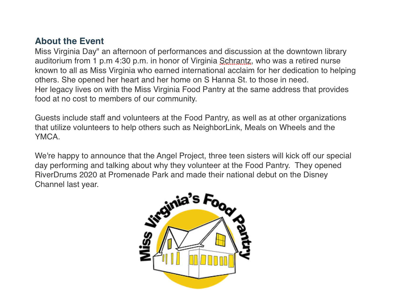 Virginia Schrantz, known to all as Miss Virginia, was a retired nurse who earned international acclaim for her dedication to helping others. She opened her heart and her home on S Hanna St. to those in need. Her legacy lives on with the Miss Virginia Food Pantry at the same address that provides food at no cost to members of our community. Over the years, Virginia Schrantz' tireless efforts and her firm belief in aiding and caring unconditionally for all those in need have inspired other organizations, schools and individuals across the community to get involved and lend their support to her program. This one amazing woman's vision of ending hunger in our community has since burgeoned into a community wide effort that lends not only physical aid but also a voice to neighbors struggling through hard times. Her legacy of giving and caring is her gift to us all. Because when we choose to give and care it benefits our whole community, both helping those in need and offering us all an opportunity to be a part of making a difference in our world.
