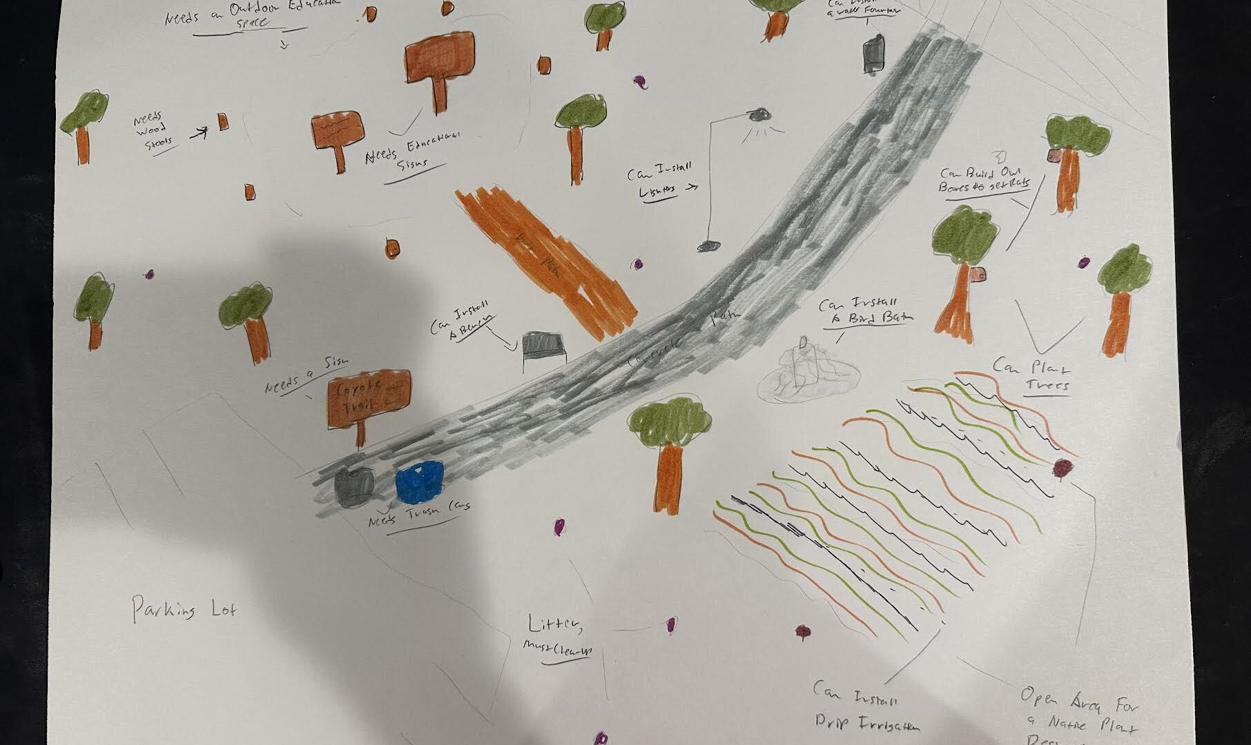 The Coyote Trail, the only natural area on the campus of Calabasas High School, is severely degraded, littered, and unmaintained. It is an eyesore for most who pass by it every day. The area has little native vegetation, contains plastic and other littered trash, contains overgrown and dead vegetation, and has little to no soil.