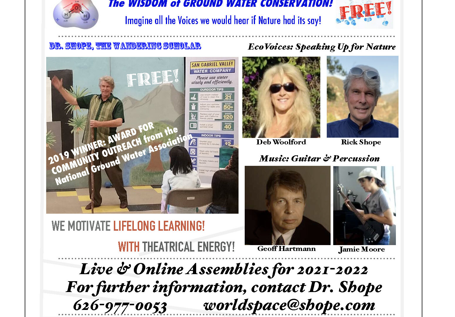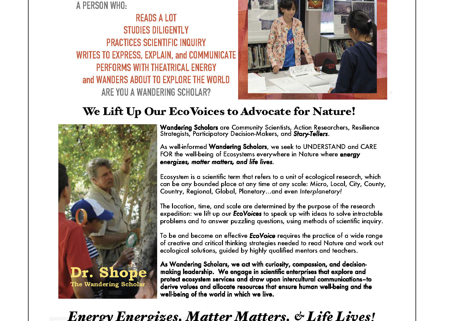 Generally, providing Inquiry Science Expeditions for urban youth in the Greater Los Angeles area through our EcoVoices Institute, as a project of the World Space Foundation, dedicated to Scientific, Educational, and Literary enterprises. I am the President of the World Space Foundation, a nonprofit providing science education services primarily to grades 3-8 in the San Gabriel Valley. Our EcoVoices Institute Director is Deb Woolford, long affiliated with the Millikan Middle School Roots and Shoots Project.