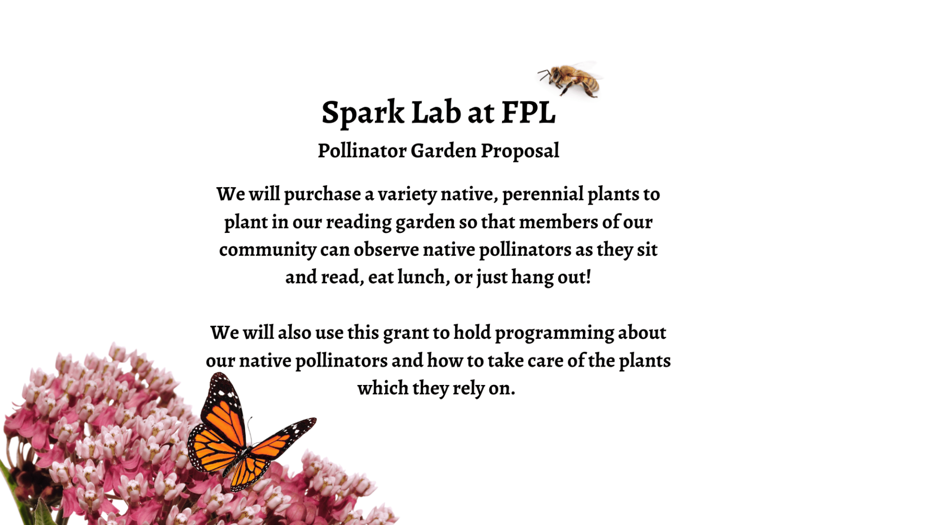 The area in which our library is located is becoming increasingly developed and urbanized. We want to support our local flora and fauna from habitat loss. We will build a space where they can flourish, safe from pesticides and creeping urbanization.