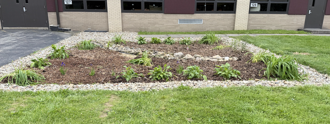 This project hit a lot of bumps in the road that were out of my control but the rain garden has finally been completed. Students helped with the research, design, growing plants in our grow room and then transplanting them in the rain garden.