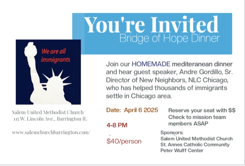 We formed a company where as officers we are hosting a dinner for about 100 people to fundraise and get to know a few of these refugees and migrant families. We will assemble a team of youth and adult volunteers to collaborate with local businesses, market, do PR campaigns, make videos, sell tickets to the event and work as hosts, clean up crew and servers at the event to be held on April 6th 2025 at Salem UMC, Barrington.