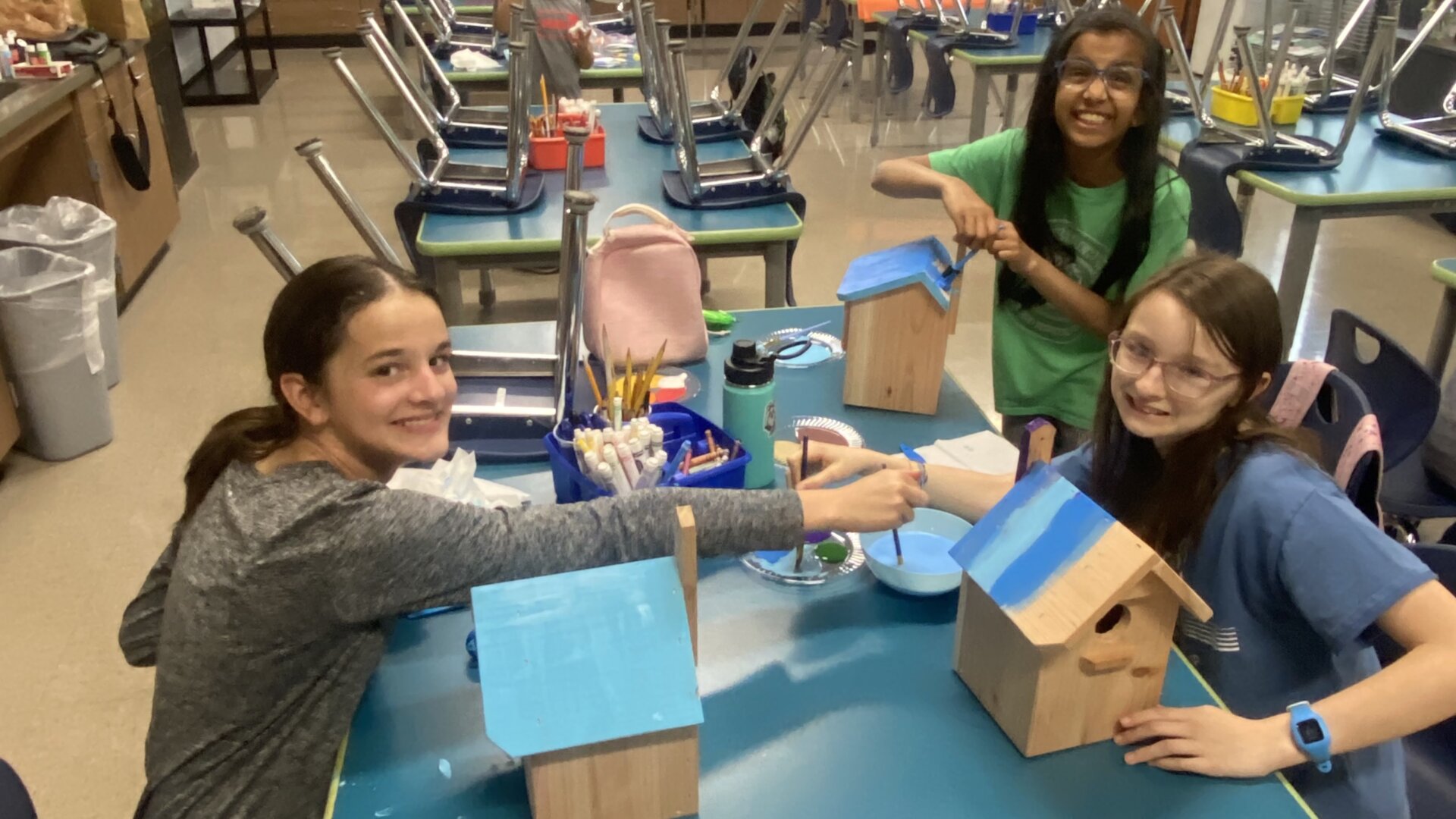 We used the format of the 4-step formula for this meeting. Get engaged: We created a presentation describing the impact of invasive species and we watched a video. Observe: We went outside to the playground and played a game similar to Capture the Flag, with one team being the "native species" and the other team with more players and high school participants being the "invasive species." Take Action: In order to combat the issue of invasive bug species, we painted and decorated birdhouses. The goal of this was to increase the population of the invasive species' natural predators. Celebrate: We had snacks from various local businesses and watched Jane.