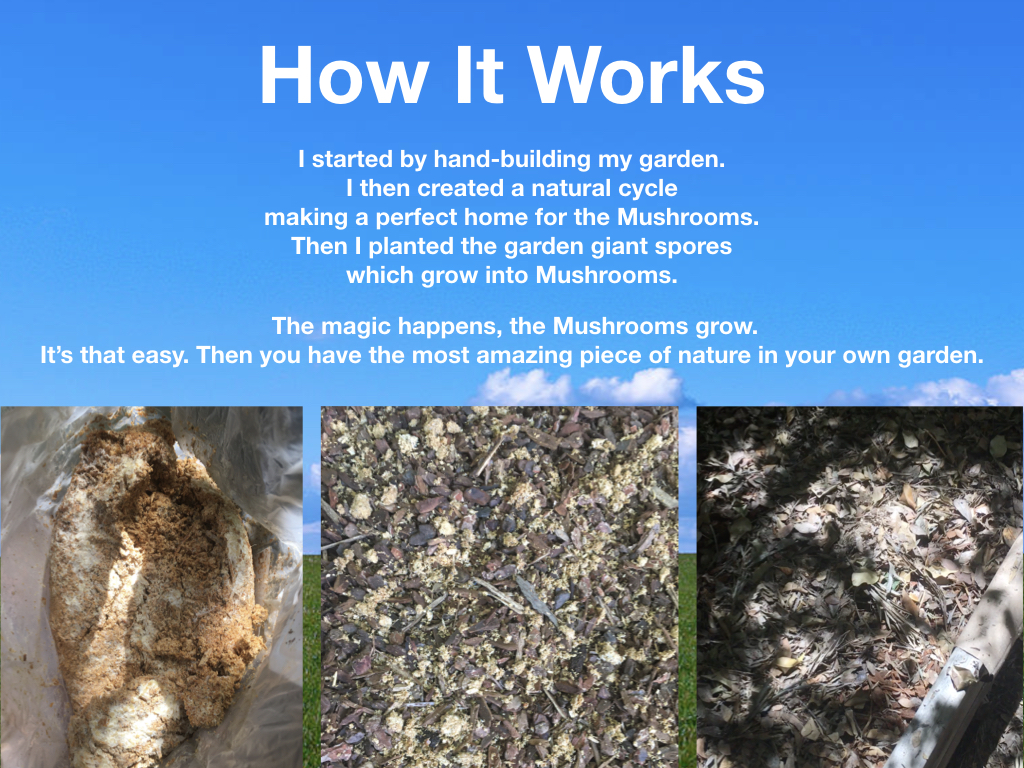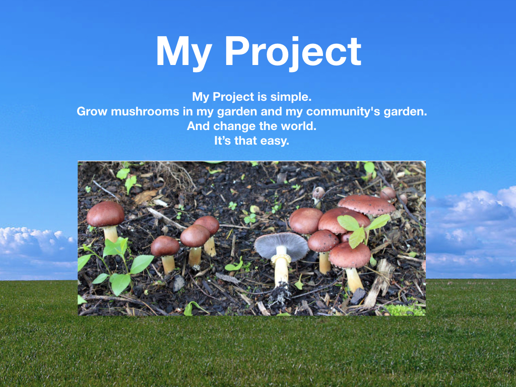 I am documenting how to grow mushrooms as it is a simple process once the methodology is known. Then, I plan to contact garden teachers at pre-schools and elementary schools and teach them how to do this. Of course, being able to see giant mushrooms and experience their amazing taste will help to motivate young people. I will also let them know the amazing discoveries that have been made about mushrooms. A few incredible benefits of mushrooms: saves bees from succumbing to mites, filters toxins out of soil, acts as a natural pesticide, regenerates dead zones created by oil spills, supplies nutrients to all plants and trees and boosts human immune systems. I will get the word out about mushrooms as being a miraculous gift of the Earth.