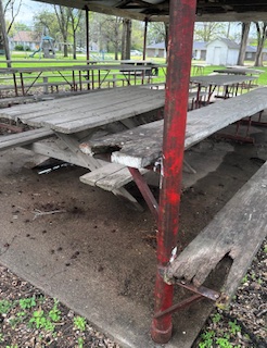The picnic benches at the park are in dire condition and broken beyond repair. Families do not have a place to sit, visit, or picnic while their children play at the park.