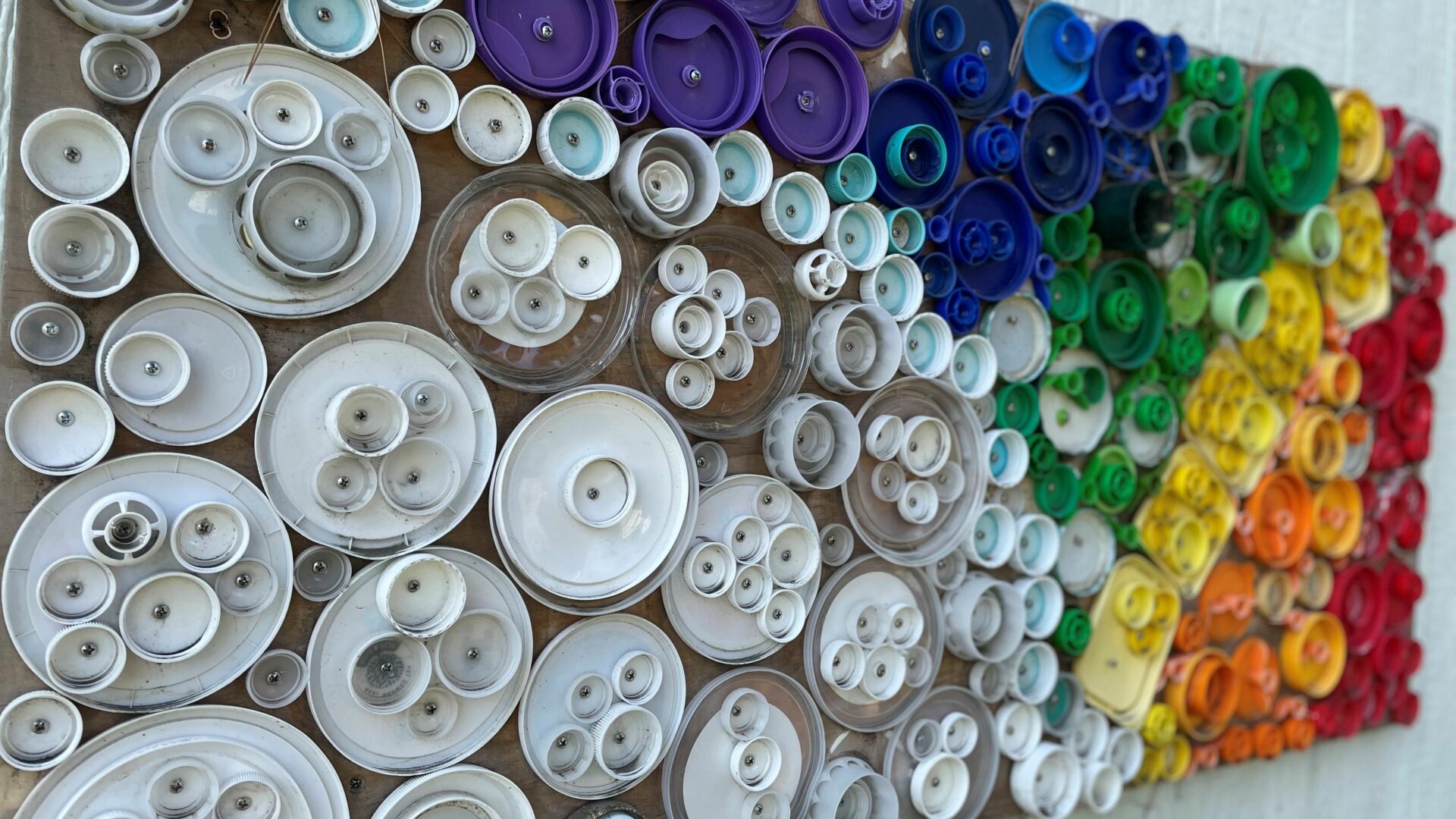 Our families were very responsive with donations of bottle caps and lids to create our project. One of our parents took the lead of assembling the art project, and utilizing it to beautify our outdoor space!