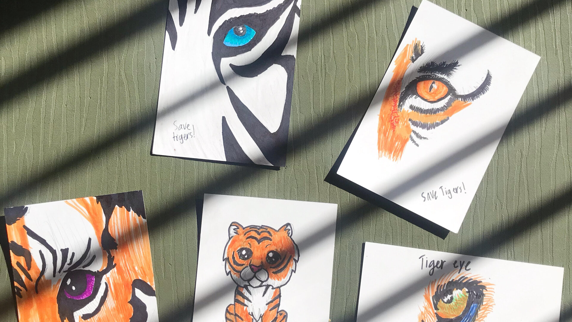 The project went great and was a great learning experience! I read a lot of books about tigers from the library and watched videos. I did a presentation to my class about different sub-species of tigers and some facts. Talked about the ones that are extinct and the causes. Talked about why it is important to save tigers for the future of the planet. We discussed some of the ways we can help conserve tigers such as raising awareness, protecting their habitats, being responsible, and ways to reduce human-tiger conflicts. Explore ways to support the governments to give space and freedom to the tigers. I also did 5 postcards with the theme - Eye of the Tiger. I love art and I want to use my love for art for causes that I care for. I raised about $30 from selling 5 cards. Donated $60 to WWE by adopting a tiger! I will work on more ideas and more ways to raise awareness to save these beautiful species