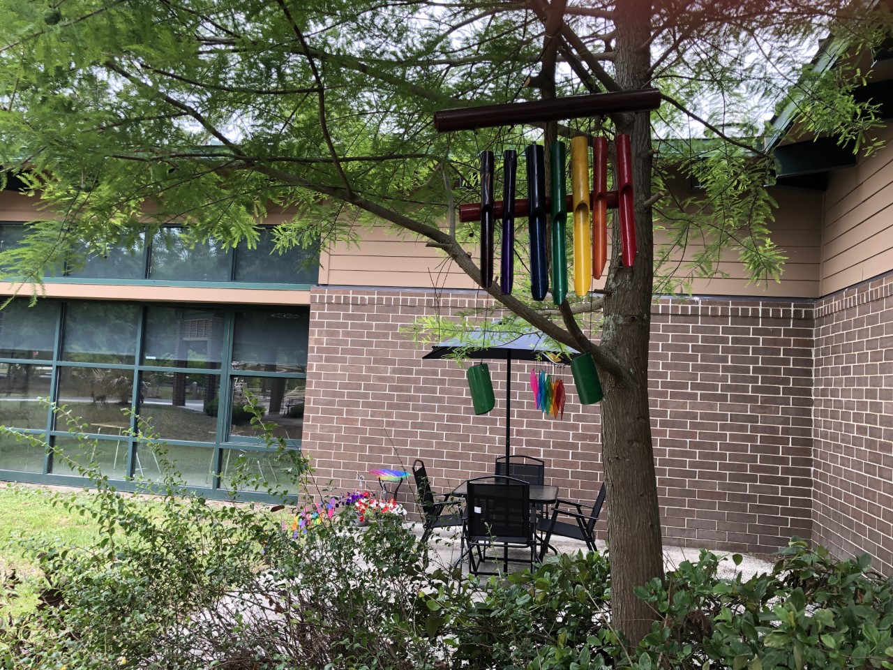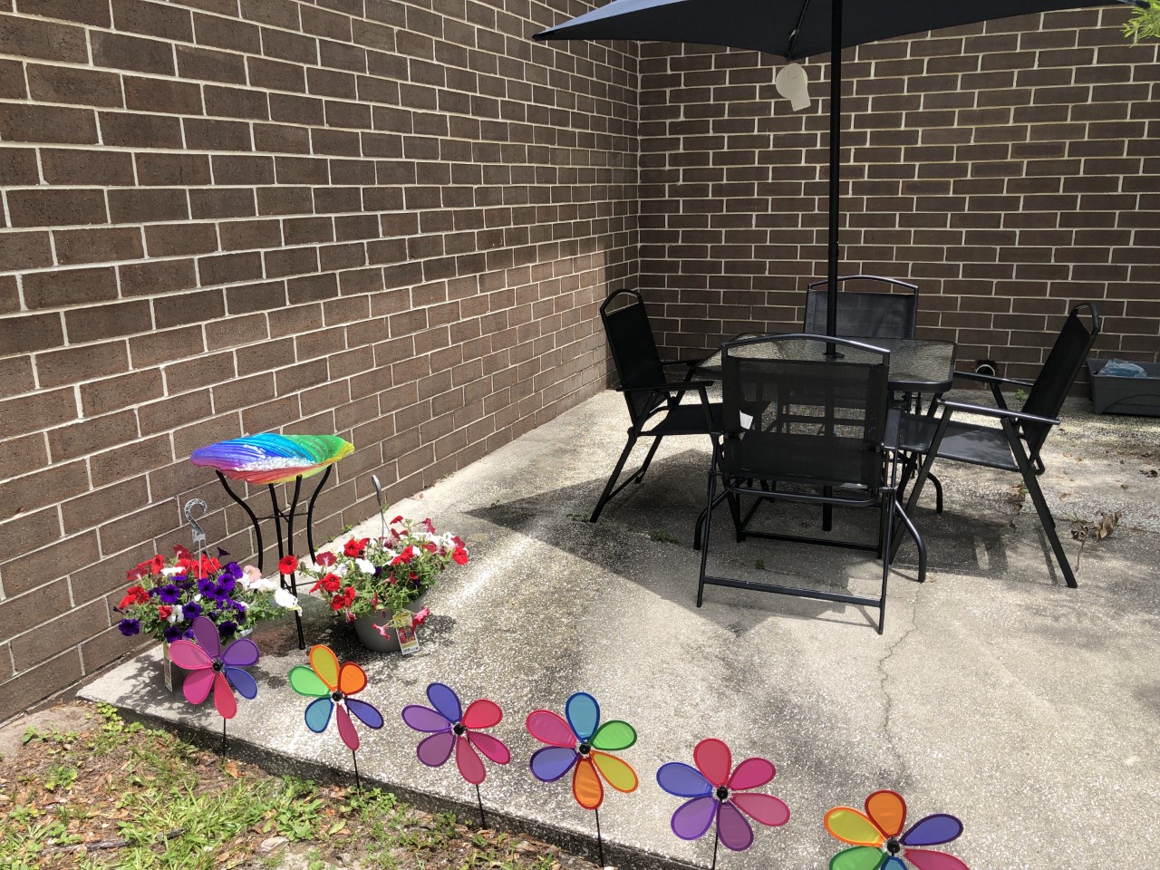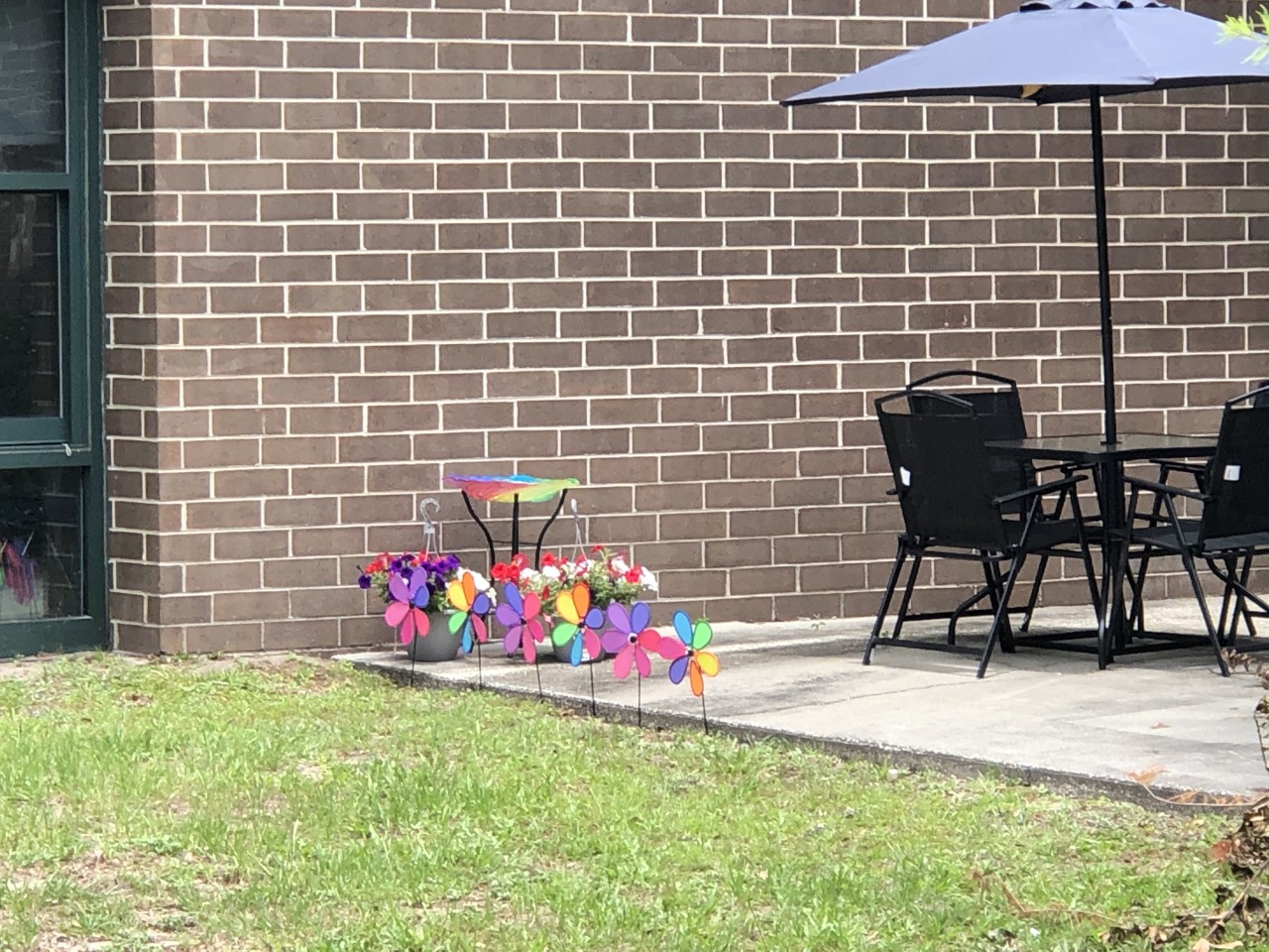 This was such a fun project. With the Jane Goodall Institute and Roots and Shoots Mini Grant we were able to make great strides toward our sensory garden. We were able to purchase 2 colorful windchimes. One was made with bamboo the other glass. They are both bright and produce different sounds when the wind blows. The bamboo windchime came with an attachment so the students can create their own sounds when they tap the chimes. We also purchased a brightly colored bird bath. We placed marbles on the bottom of bath so our pollinator friends (the bees) can take a little rest and have a drink. Another purchase the students loved was the sand play station. We finished up our grant funds with the purchase of potted flowers, patio set and several primary colored windmills.