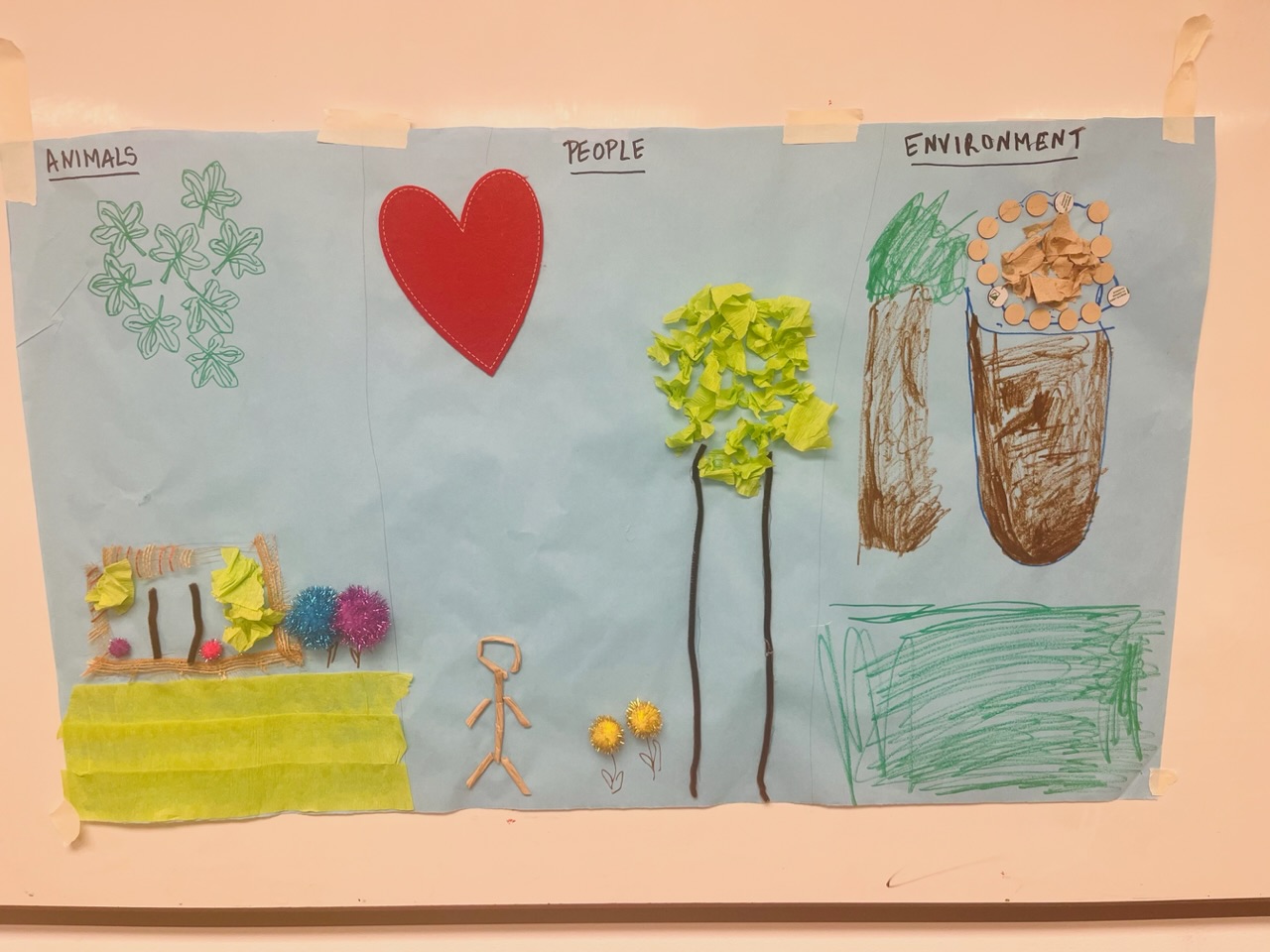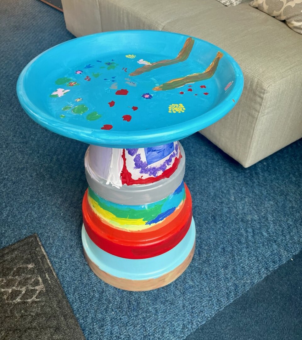 It was awesome! We painted clay pots and a clay saucer and we assembled them into a bird bath. We also made bird feeders from pine cones. We put natural peanut butter and assorted birdseed on them.