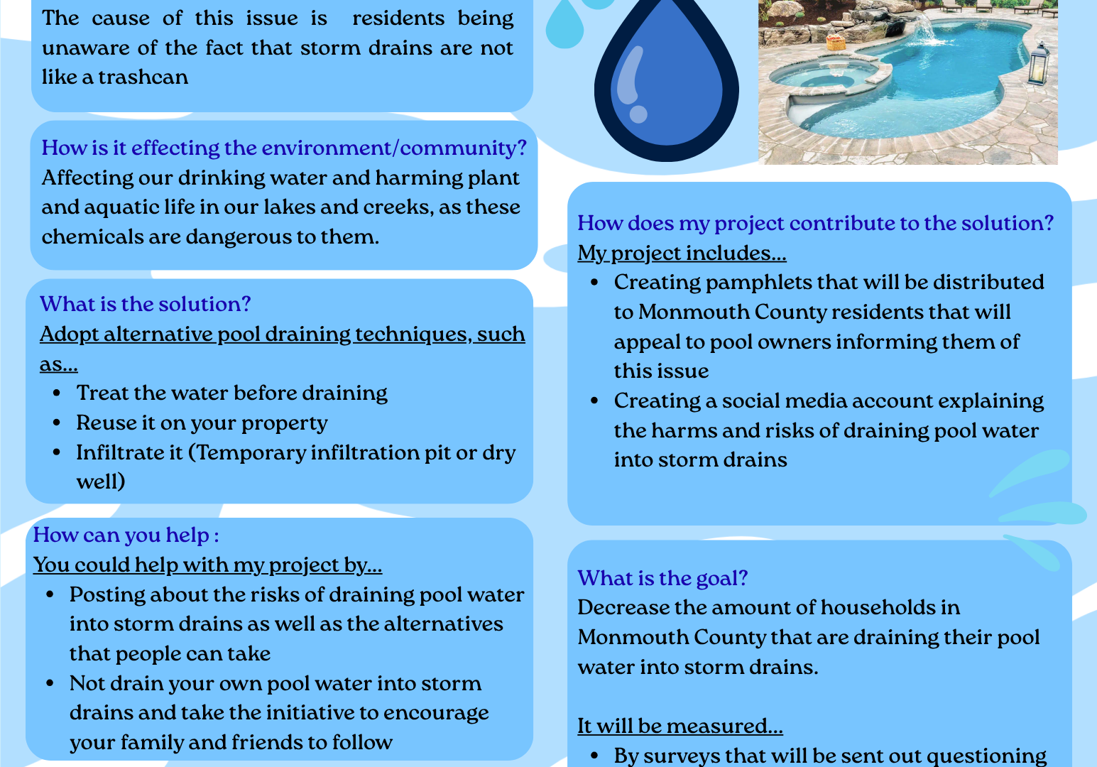 We aim to raise awareness, inspire action, and provide alternative pool draining techniques. Specifically, we will be creating pamphlets that will be distributed to local communities that will appeal to pool owners informing them of this issue. Also, we will use social media to obtain a larger reach, explaining the harms and risks of draining pool water into storm drains, alternate draining techniques, and engaging content to encourage responsible practices and prevent this issue. Instagram : @thinkbeforeyoudrain